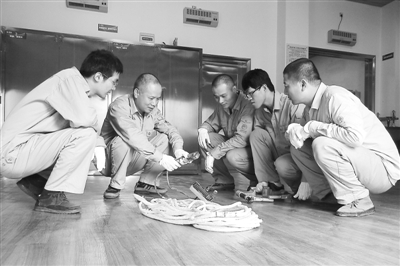 福州电业局“冯振波劳模创新工作室”成员在研讨创新工器具。