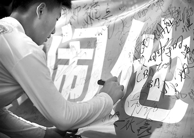 5月1日,山西中宇队球迷在横幅上签字挽留球队。