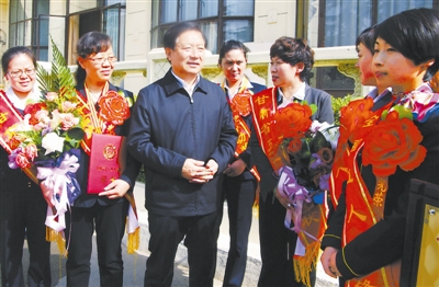 4月25日,甘肃省人大常委会副主任、省总工会主席孙效东与获得“五一双奖”的女职工代表亲切交谈。