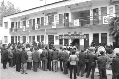 图为2013年4月25日,巡回法庭到辖区新店镇薛庄村审理某机械公司诉薛某侵权纠纷一案的情形。