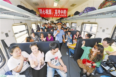 鄂伦春自治旗大杨树镇地处大兴安岭南麓,是鄂伦春、达斡尔、鄂温克等少数民族聚居区,由于镇区没有设置高考考点资格,每年高考有近千名考生赶往135公里外的阿里河镇参加考试。自2003年,哈铁局加格达奇车务段开行“高考专列”以来,已将1.8万余名考生安全运往考场。 新华社发(侯玉鹏 摄)