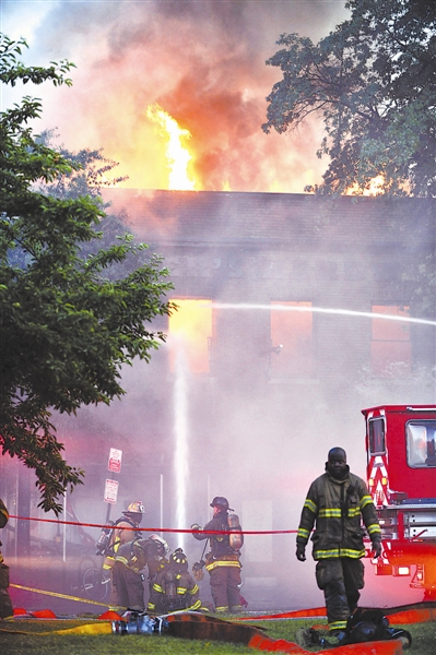 6月5日,消防员在美国首都华盛顿东南部的火灾现场救火。当日,位于国会山东南方向的“弗雷杰”五金和油漆店发生火灾,火场浓烟滚滚,整个华盛顿都清晰可见,至少两名消防员受伤。 新华社记者 张军 摄