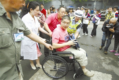 6月7日,北京市一高考考点,一位受伤的学生在家人和工作人员的帮助下进入考场。