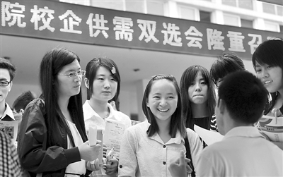 近日,在安徽三联学院招聘现场,参加招聘的大学生在与用人单位洽谈。安徽省合肥市经开区人才中心联合安徽三联学院举办“校企供需双选会”招聘活动,68家知名企业为大学毕业生提供了3860个就业岗位,涉及行政主管、人事助理、软件开发工程师等多种职业和岗位。
