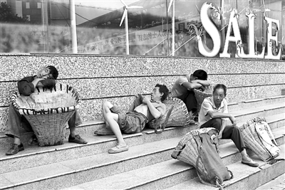 6月6日,贵州省贵阳市。“背起背篼满城走,哪有重活哪有我”,贵阳的大街小巷有十几万背篼军,他们是从全省各地来到省城的农民工,每天背着背篼到处寻游,招揽活路。