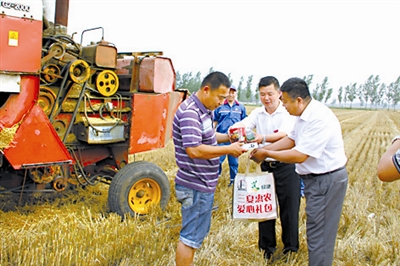 麦熟时节,遍野金黄。中国石化安徽淮北石油分公司保障农业生产用油,慰问参与夏粮抢收的收割机手,为他们送上“三夏惠农爱心礼包”。图为淮北石油客户经理和加油站站长送油到田间地头。徐杨 摄