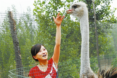 6月8日,在河北省霸州市经济技术开发区北头村,毕业于河北农业大学的张蕊在养殖场里察看鸵鸟的生长情况。