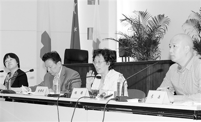 6月14日,社监委委员袁岳、杨团、黄伟民和金锦萍(从右至左)在媒体见面会上。