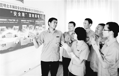 6月12日,昆明铁路局昆明北车辆段5T运用车间安全员唐利波(左一)给职工解读班组“安全屋”时的情形。黄再云 摄