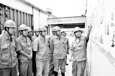 6月11日,中石油管道局四公司CPP—4D1机组安全总监安晓科(右一),为员工讲解班组安全屋“5831”模式。宋洋 摄