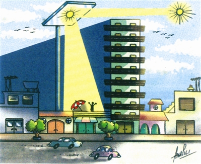 阳光——人们生活里最渴求的享受,画中采光的方法似曾相识。40年前,在相声大家侯宝林居住的南屋窗前就见过类似“装置”。