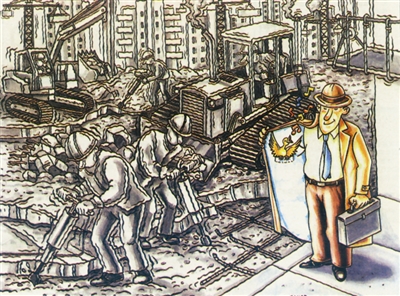 今日城市犹如大工地。随处可见钢筋水泥,时时听闻机械轰鸣。虽然寻找花香鸟语已成奢想,但此公怀揣黄莺嘤鸣真乃不亦乐乎。