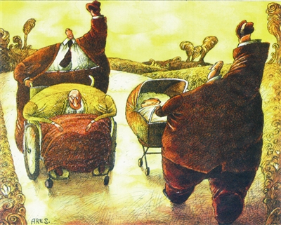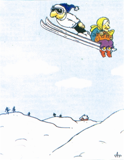 漫画中滑雪板“捎”人,多是比喻成累赘或失衡。俄罗斯画家拉丁却将此项运动画成助老为乐的善举,让读者感到格外亲切与温馨。