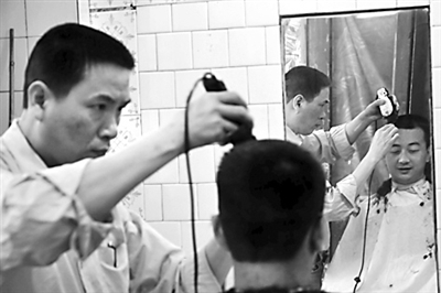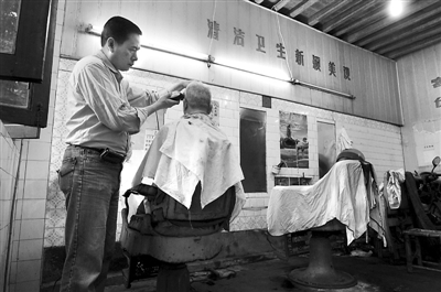2013年5月14日,福建省福州市上藤路上,一家理发店内旧式门框、白瓷脸池、陈旧的海报、别具一格的白色制服以及上世纪60年代留下来的刮胡刀、推子、理发椅,让人们好像又回到了几十年前。二三十年前,如果在这儿理个发,被认为是一件很时髦、奢侈的事儿。如今,这儿的顾客年龄普遍都在35岁以上。店内59岁的老师傅陈水平正忙着为顾客剪发、刮脸、染发。陈师傅说,这家理发店开业至今已30多年了,可能是福州现存的最后一家具有国营性质的理发店。19岁那年,陈水平通过招工进入到福州市影食服务公司下属的一家理发店,上世纪90年代,陈师傅所在的单位进行了改制,原来店内最多时有10余个理发师,到现在只剩下了他和另外一个同事。随着城市建设,福州上藤路在地铁站建好后将拓宽,这条路上的不少老建筑即将面临拆迁。 张斌/东方IC