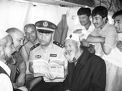 乌鲁木齐铁路公安局和田站派出所针对少数民族旅客较多的实际,将维汉“双语”教学作为和谐警民关系的基础性工作来抓,全面推行“学双语,无障碍为旅客服务”活动。通过发放双语学习手册、收看视频资料、播放教学磁带、开辟学习竞赛广角等方式,不断提高铁警的维汉“双语”对话技能。图为铁警虚心向少数民族旅客请教常用语词句发音。(孙婉茹 李治/文 许荔/摄)
