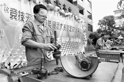 6月18日,在广西融水苗族自治县职业教育中心,几名学生在参加蒙眼拆装发动机比赛。在为期一个月的“‘竞技天下’技能展示大赛暨艺术节”上,200多名学生先后参加了蒙眼拆装发动机、电子琴、绘画、剪纸、舞蹈、“精彩我SHOW”书画等大赛,提高了学生对未来工作岗位的适应能力。廖子渊 摄