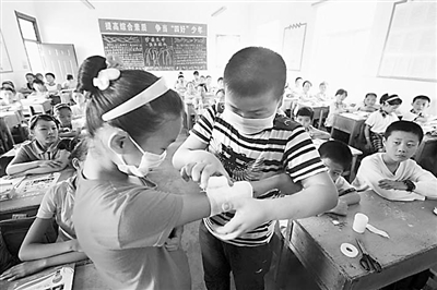 6月6日,安徽省合肥市瑶海区农民工子弟学校——常胜小学里,学生们正在学习了解相关防震减灾、紧急避险和自救互救等知识,并现场进行受伤包扎及应急疏散演练。解琛摄