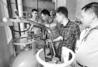 6月20日,福建省闽侯县安全监督人员在上街镇家园酒楼检查液化气设备及使用情况。