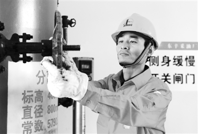 为检验“多功能抽油井增效装置”,吴吉林在油气计量站进行单井产油量计量