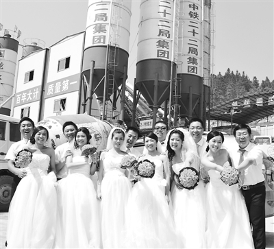 6月16日,在重点工程厦蓉高速公路毕(节)生(机)段建设工地,中国铁建二十二局集团五公司6对青年举行了集体婚礼。青山为背景,工地是舞台,青年们在火热的工地收获爱情,喜结连理。王秉良 于亮 摄