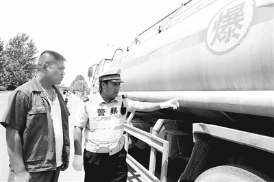 大货车安装反光标识勾勒车身轮廓,可以增加车辆的安全间距,有效预防和减少夜间追尾交通事故的发生,但在公路上行驶的许多大货车的反光标识早已褪色并被污垢遮住。日前,河南武陟县交警大队开展对不安装反光标识和反光标识模糊不清货运车辆专项执法活动。图为执勤民警在公路上对一反光标识模糊不清的危化车纠章的情形。