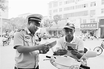 针对夏季交通安全事故多发状况,河南平舆县公安局开展交通安全宣传活动。图为民警正在发放安全常识卡片。李卫信 徐翔云