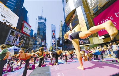 当地时间6月21日,在美国纽约时报广场上,上千名瑜伽爱好者陆续聚集于此,用集体瑜伽的方式迎接夏至的到来。谢涛 供图