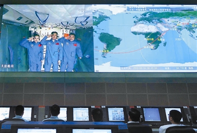 6月24日,中共中央总书记、国家主席、中央军委主席习近平来到北京航天飞行控制中心,同正在天宫一号内执行任务的神舟十号航天员聂海胜、张晓光、王亚平通话。这是航天员在敬礼。 新华社记者 李涛 摄