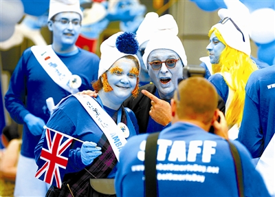 当地时间6月22日,法国巴黎,蓝精灵粉丝在埃菲尔铁塔附近欢度世界蓝精灵日,并庆祝蓝精灵之父贝约85岁生日。阿健 供图