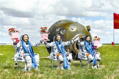 6月26日,圆满完成任务的三位航天员张晓光、聂海胜、王亚平(从左至右)自主出舱后向人们致意。