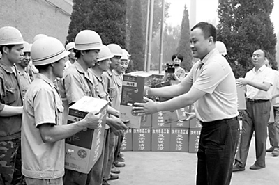 6月24日,河南省汝州市人大常委会党组成员、市总工会主席姚军柱带领机关工作人员,深入到高温工作场所、生产车间、园林修剪工地,把防暑降温物品送到施工第一线,从而拉开了全市工会组织为一线职工送清凉帷幕。图为姚军柱等为一线职工发放防暑降温物品。李军现 摄