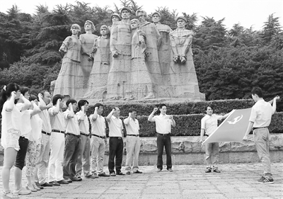 6月23日,中铁四局电气化公司上海调度所项目党支部组织全体党员、入党积极分子一行17人,到南京雨花台革命烈士陵园接受爱国主义教育,缅怀先烈,凝心聚力,实干兴企,以“红色之旅”向党的92周年华诞献礼。图为全体人员在烈士群雕下重温入党誓词。曹红 陈锋 摄