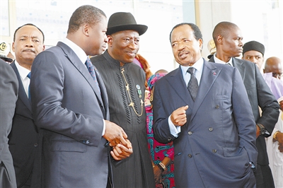 6月24日,在雅温得,喀麦隆总统比亚(前右)、尼日利亚总统乔纳森(前中)和多哥总统福雷(前左)在几内亚湾海上安全峰会开幕式后交谈。 法布里斯·恩贡 摄 (新华社发)