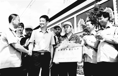 6月20日,沈阳铁路局团委副书记李龙(前左二)将团中央、国家安监总局命名的“全国青年安全生产示范岗”牌匾授给新民站调车组。沈铁锦州车务段新民站始终把安全生产放在首位,执行规章制度不走样,安全调车30年,在全路同行业调车作业组中名列前茅。 高锦旭 摄