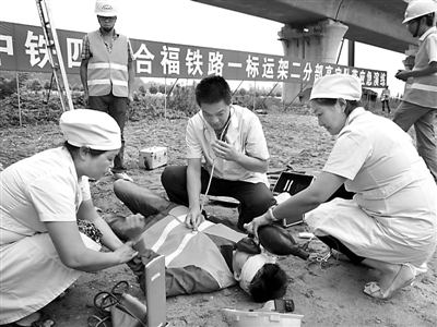 “从南淝河大桥48墩上,坠落一名架梁工人,初步断定腿骨折,头部受伤,请求救援!”这是6月27日,中铁四局四公司合福铁路南淝河大桥架梁现场高空坠落应急预案演练的一个镜头。此次演练,既检验了应急预案的可操作性,又提高了项目部和施工人员对突发事故的快速反应能力和应急救援水平。应急预案演练,是中铁四局开展“全国安全生产月”活动的重要内容。李晓明 摄