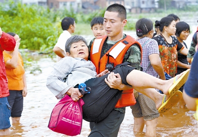 7月1日,在潼南县柏梓镇,消防战士抱着被救出的受灾群众走向安全区域。