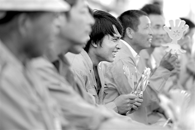 7月2日,中铁四局的一线建设者在工地上观看文艺节目。