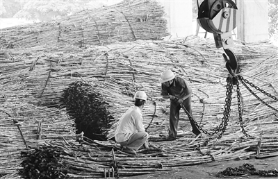 图为广西上思县一制糖企业工人吊起甘蔗准备压榨。东方IC
