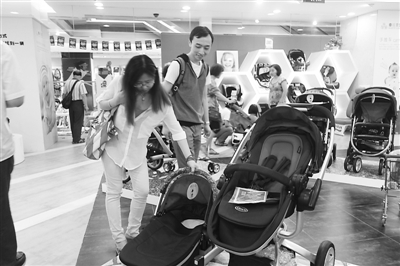 图为北京一家商场内顾客在挑选婴幼儿用车。孙喜保 摄