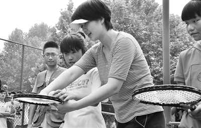 图为河南省郑州市,奥运冠军孙甜甜辅导农民工子女打网球。6月23日,河南省乒网运动管理中心副主任、2004年雅典奥运会冠军孙甜甜来到郑州春笋民工子弟学校,教学生打网球。张涛/CFP