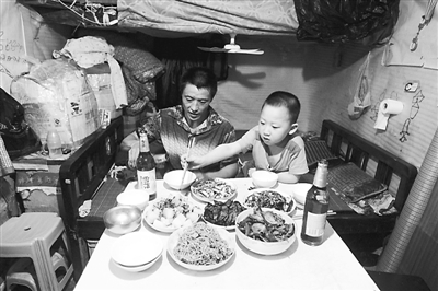 父亲叫冉光辉,今年44岁,已经在重庆当了20多年的“棒棒军”。儿子叫冉俊超,今年7岁,很快就要上小学一年级了。他们租住在朝天门批发市场附近的棚户区,屋子只有10多平方米,房租每月300元。