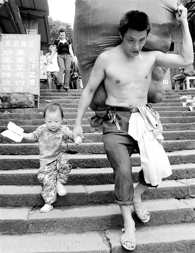 一位父亲扛着100多公斤的货物,一只手紧紧抓着货物的一个角,另一只手牵着孩子从梯坎走下来,嘴上还叼着一根烟。笔者拍下了这个画面。
