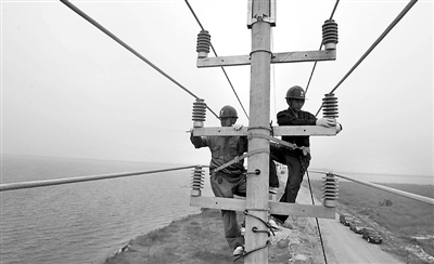7月7日,山东潍坊电网的工人冒着炎热酷暑在检修线路。近年来,随着潍坊加大沿海开发力度,大批新项目落户,用电需求大幅增加,潍坊供电公司加强现场勘查,并实行一对一跟踪服务,为潍坊沿海区域的经济发展提供充足的电能供应。本报记者 许之丰 摄