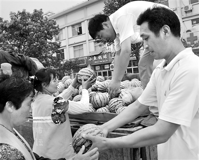 7月7日,江苏省连云港市连云区云山街道环卫工人领到了工会干部送去的西瓜。连日来,该区各级工会干部开展“送清凉、美环境”活动,为环卫工人送去绿豆、风油精、西瓜、矿泉水等,让在烈日下坚守工作岗位的环卫工人感受清凉。