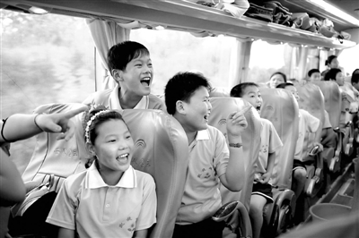 7月7日,河南新蔡凯旋双语实验学校的30名留守儿童,在“爱心大巴车”内唱起了欢乐的歌曲。