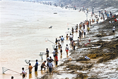 7月6日,河南省三门峡市,众多群众在黄河边捞鱼。7月4日零时许,河南三门峡大坝黄河调水调沙开始,自2002年起,黄河调水调沙工程每年进行一次,以此减轻黄河河道淤积。