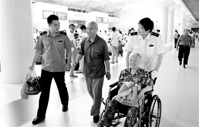 7月8日,大连站客运二班客运员护送行动不便的老年乘客进站。沈阳铁路局大连站在暑运期间,努力提升服务质量,受到旅客好评。 高锦旭 摄 (新华社发)