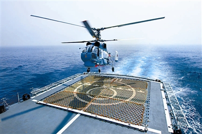 7月9日,在“海上联合—2013”中俄海上联演中,俄罗斯海军卡—27舰载直升机从中国海军沈阳舰上起飞。
