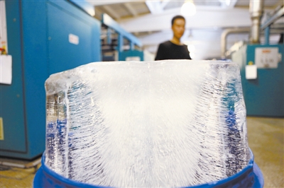 7月9日,山东省即墨市大型纺织企业即发集团染整生产车间摆放着降温用的冰块。