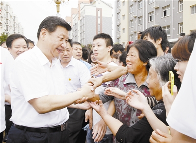 7月11日至12日,中共中央总书记、国家主席、中央军委主席习近平在河北省调研指导党的群众路线教育实践活动。这是习近平看望正定县塔元庄村村民并同他们亲切握手。 新华社记者 鞠鹏 摄